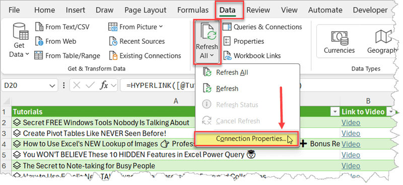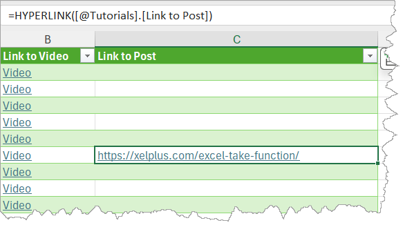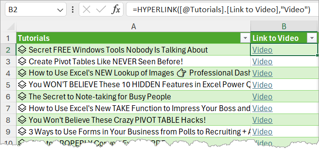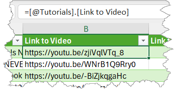 =HYPERLINK([@Tutorials].[Link to Video], "Video")As soon as you press Enter, you’ll notice the Videos are now all hyperlinked. If you click on the link, it will take you to the relevant YouTube video.