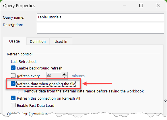 In the Query Properties dialog box, place a checkmark next to “Refresh data when opening the file“.