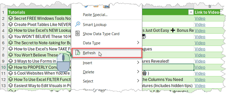 If you don’t want to miss my new videos, all you have to do is Subscribe to my channel 😉. But now, you have also built a direct connection to a complete library of free tutorials in Excel. Whenever the file on the website is updated, you can simply open your own file, right-mouse-click on the table and Refresh. You can also use the shortcut Alt + F5 (when inside the table; or Ctrl + Alt + F5 to Refresh All from anywhere in the workbook).