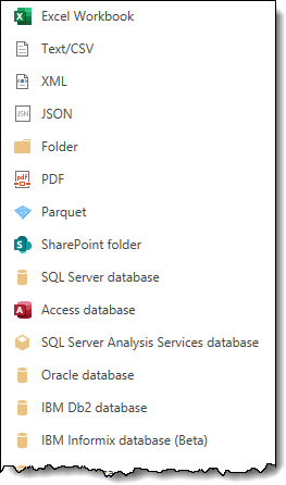 Power BI provides many connectors, which are updated regularly. Click “Get Data” to see the full list.