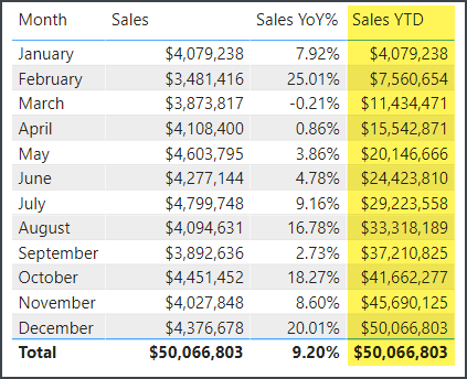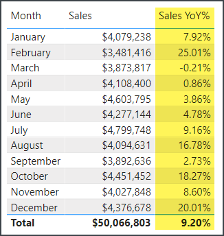 This calculation will show the YOY percentage change in sales for each month compared to the previous year.