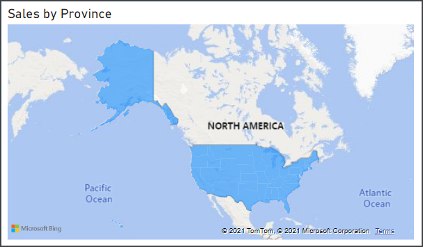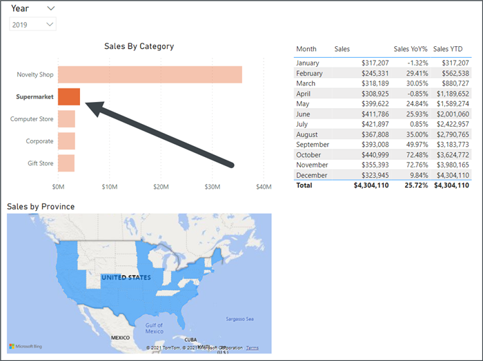 - The Filled Map chart will also update to show only provinces where “Supermarket” sales occurred.
