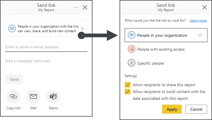 - In the sharing dialog box, enter the email address of the person you wish to share the report with, or copy the link to use in an email or instant message.
