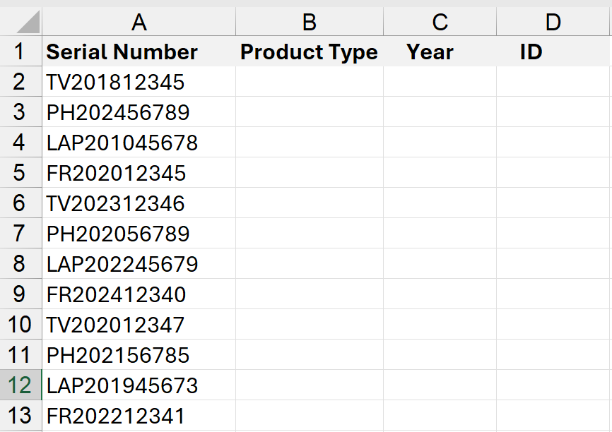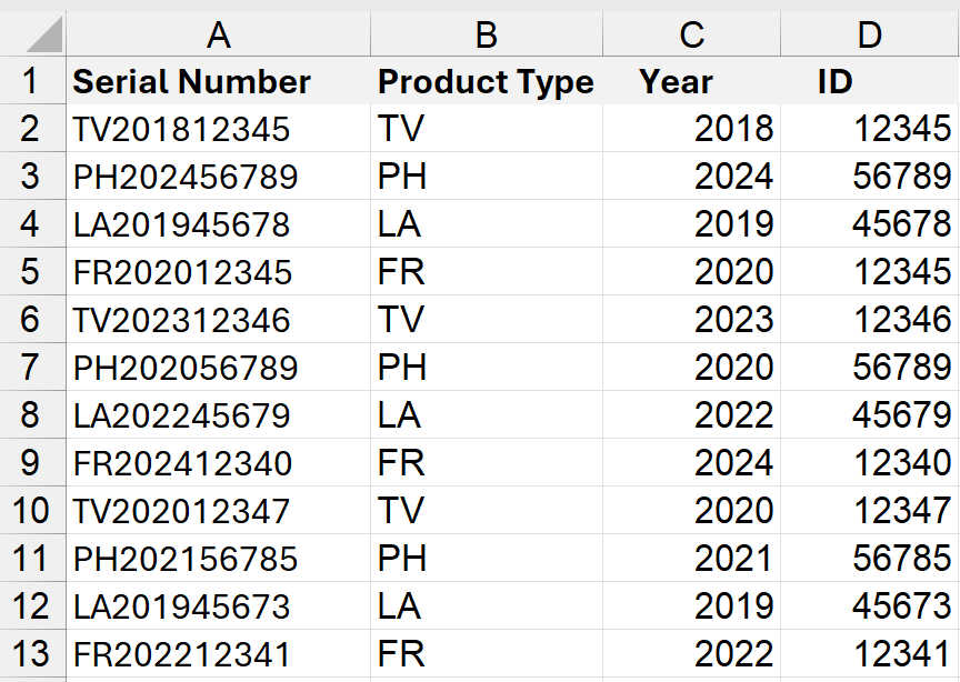 A helpful way to use Excel’s Text to Columns tool with the Fixed Width feature is when you want to split complex numbers into easier-to-manage pieces. Let’s say you have a list of serial numbers where each one includes a type, a year, and a unique identifier.