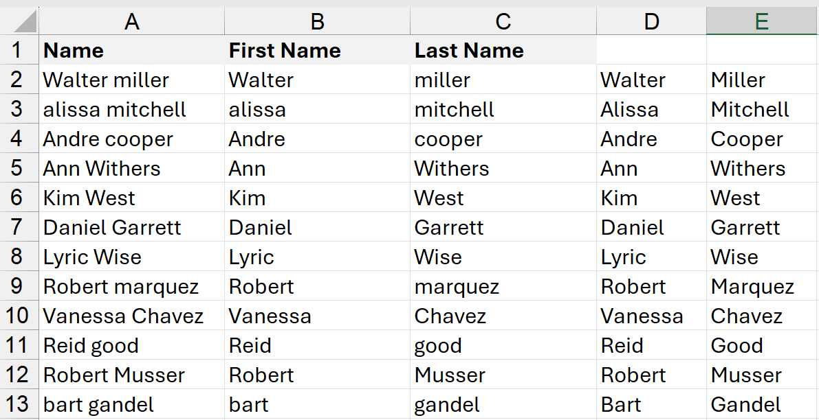 This way, each name in the range from D2 to C13 appears capitalized in two separate columns D and E.