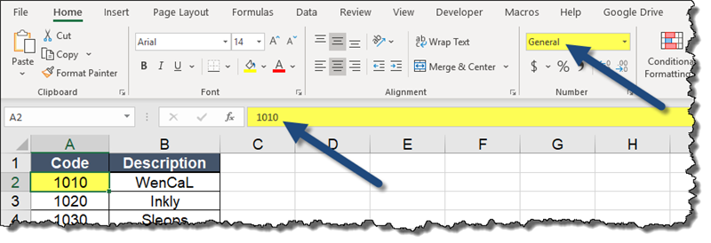 Imagine you have a table with product codes in column A (formatted as text) and descriptions in column B.