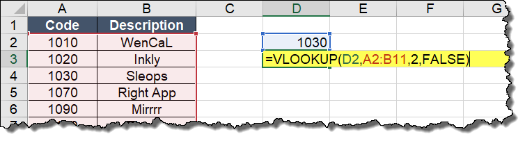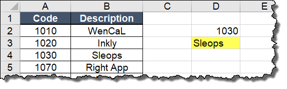 You want to find the description for a product code you enter in cell D2 using VLOOKUP in cell D3: