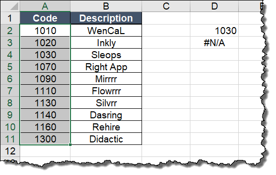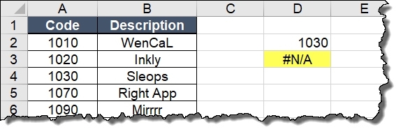 But instead of a description, the VLOOKUP function returns a #N/A error because the format of D2 (number) doesn’t match the text format of the codes in column A.