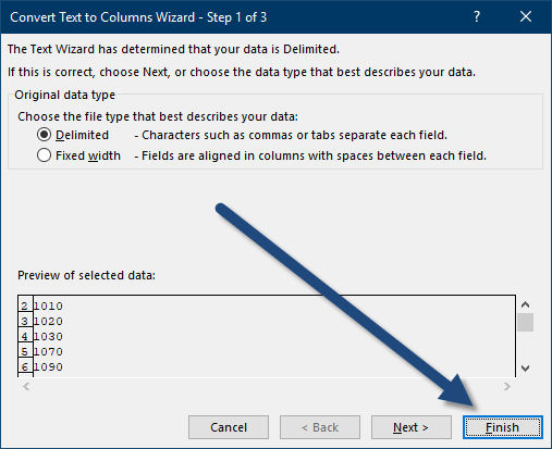 - Convert: Choose ‘Fixed Width’ (since we’re not splitting based on delimiters) and click ‘Finish’ right away without setting any breaks.