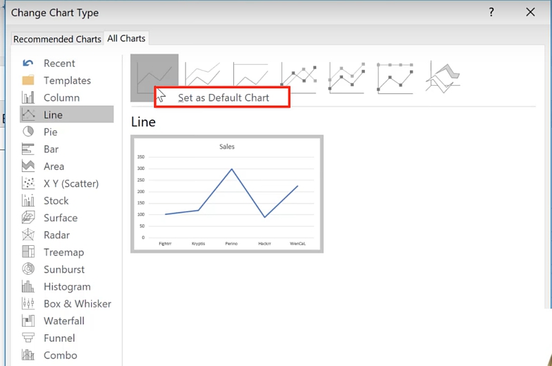- In the “Change Chart Type” window, find your preferred chart, right-click it, and select “Set as Default”.