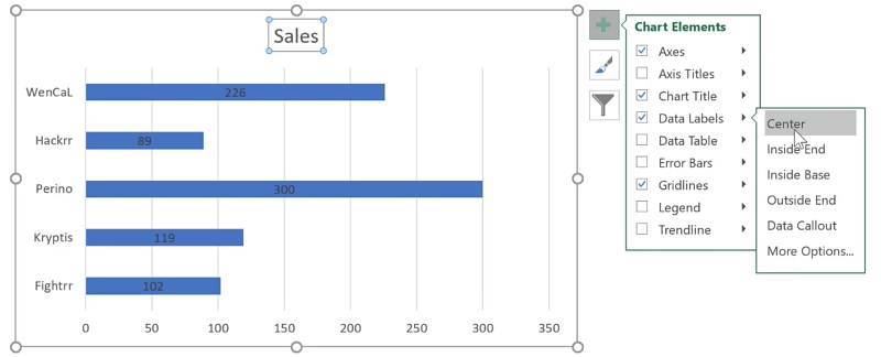 - In the Format Data Labels sidebar, choose the position for the labels. For example, place Sales labels on the Inside Base and Budget labels above.