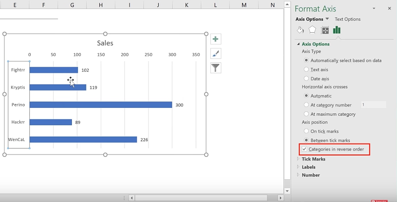 - Expand Axis Options and check the box for “Categories in reverse order.”