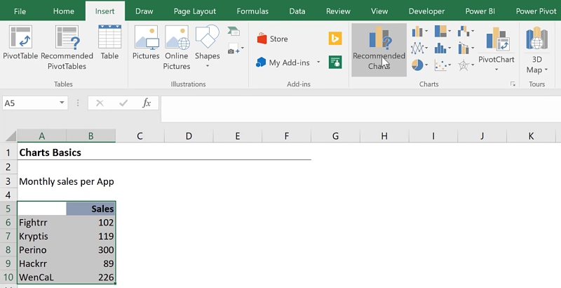 - You can also select the entire data range (e.g., A5:B10) for Excel to automatically generate the chart.