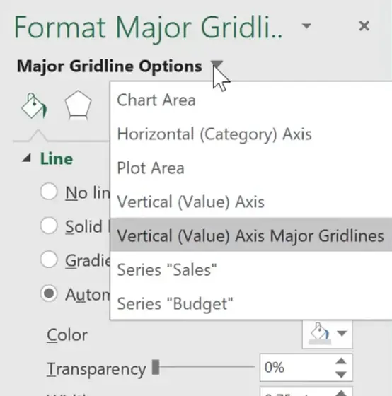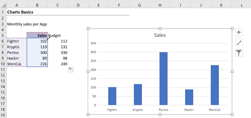 - Expand Data Range: Hover over the dot between the Sales header and values. Your cursor will change to a double-arrow. Click and drag to include the Budget column.