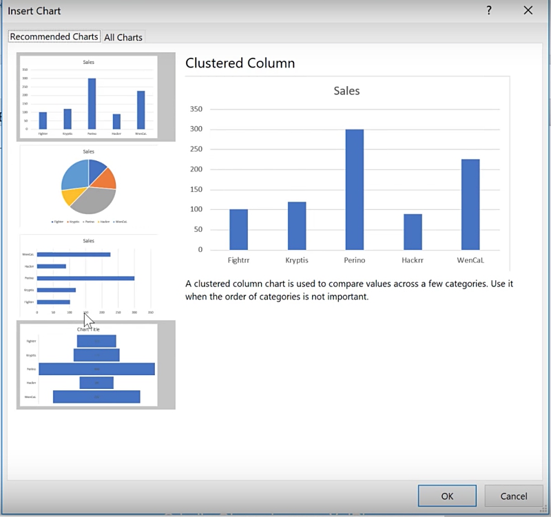 - Choose a Chart: Select the chart type you want. If unsure, click on “Recommended Charts” for suggestions. Choose one and click “OK”.