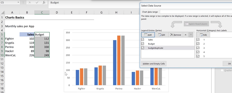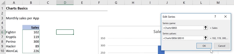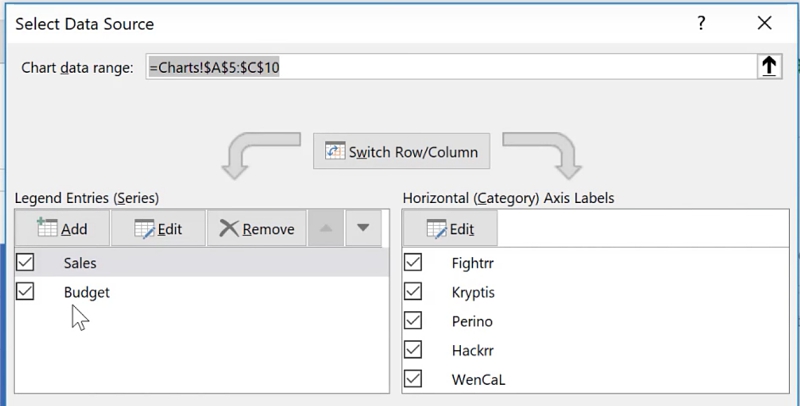 - In the “Edit Series” window, specify the Series name (e.g., Budget) and the Series values (e.g., Budget values).