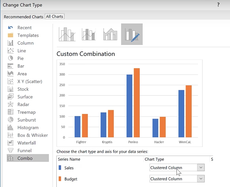 Sometimes, you need to show different data series using various chart types, like comparing actuals to budget. You can do this with a combination chart (combo chart) in Excel. Here’s how: