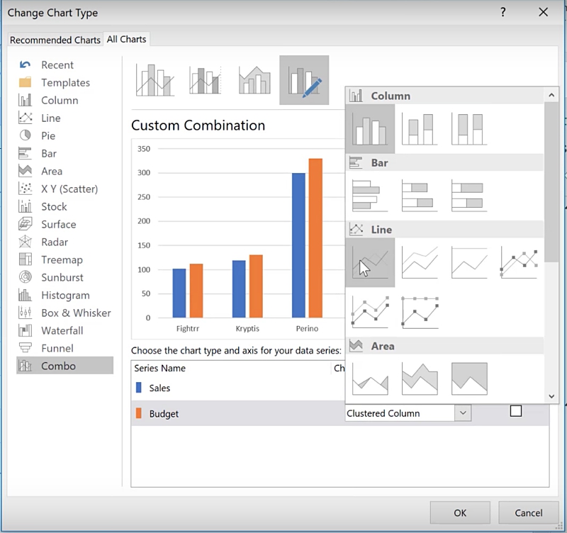 - Excel will take you to the Combo view in the Change Chart Type window, where you can change each series type individually.