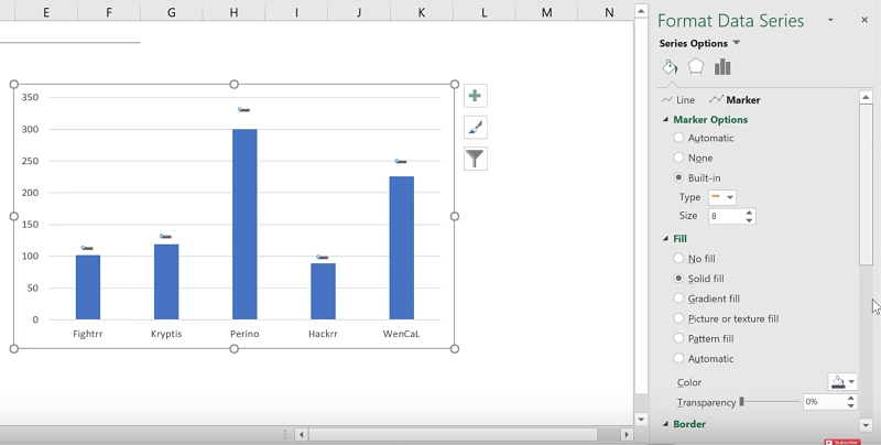 - Customize the markers in the “Marker” tab. Choose “Built-in” for Marker Options, select “dash” for Type, and adjust the size.