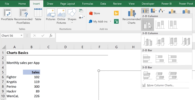 - Go to Insert Tab: Click on the “Insert” tab and select your preferred chart type. Excel will insert an empty chart canvas.