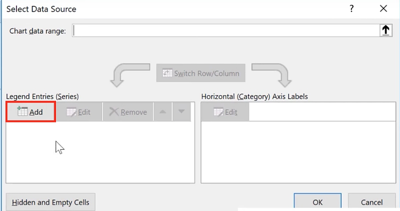 - In the “Select Data Source” window, click “Add” under “Legend Entries (Series)”.