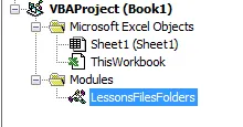 - Open the Visual Basic Editor: Press ALT + F11 and create a new module (i.e. “LessonsFilesFolders”).