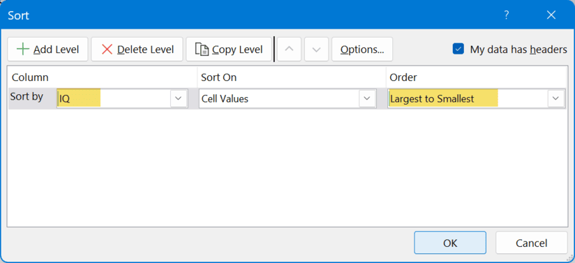 - Under Order, choose Largest to Smallest to rank from the highest IQ to the lowest.
