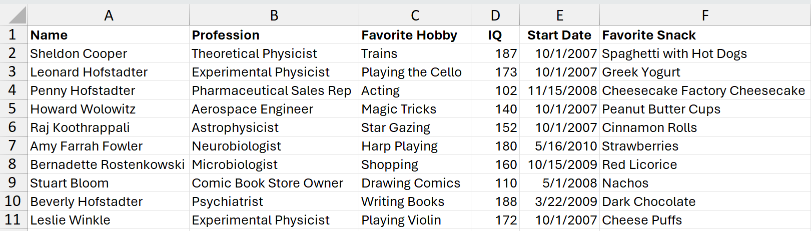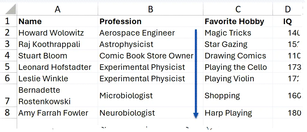 Excel will alphabetize the Profession column. All related details—like names, hobbies, and IQs—will stay with the right rows.