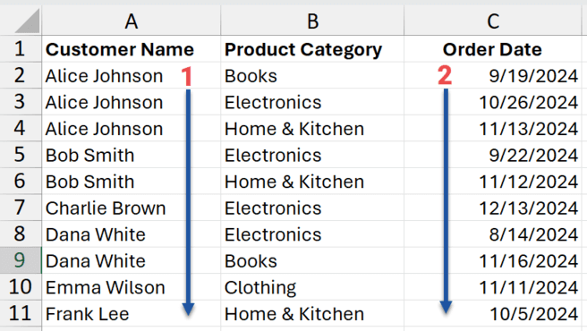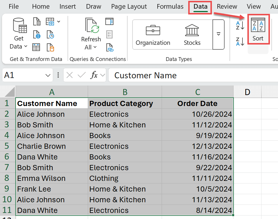 For example, in our Online Store Orders dataset, you might want to group all orders by Customer Name. Then, sort those orders by Order Date.