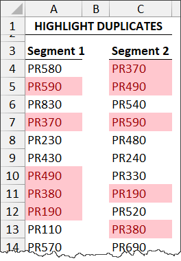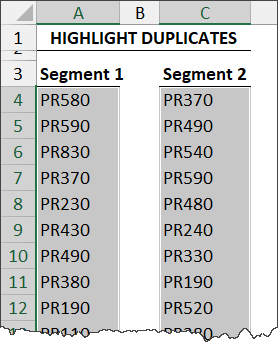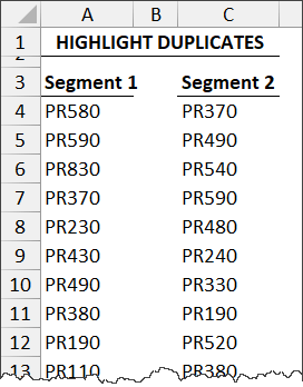 First, let’s learn how to highlight duplicates in Excel with an example. Suppose you need to find duplicate product codes in two columns, labeled “Segment 1” and “Segment 2”.