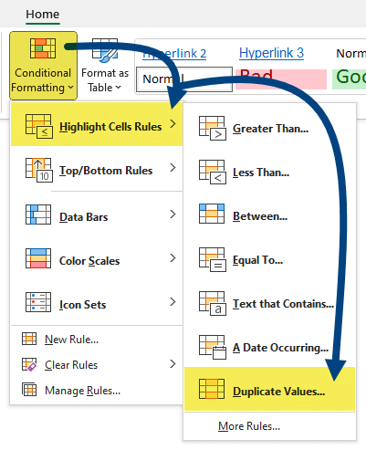- Step 2: Click on the ‘Home’ tab at the top of Excel. Then, under the ‘Styles’ section, click ‘Conditional Formatting’. Choose ‘Highlight Cells Rules’, then ‘Duplicate Values’.