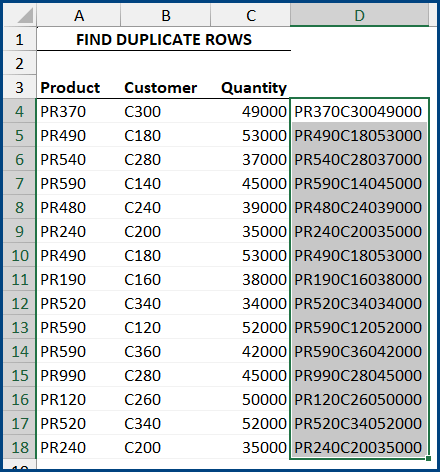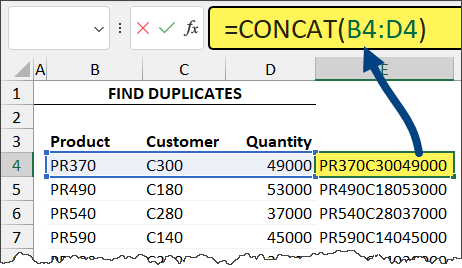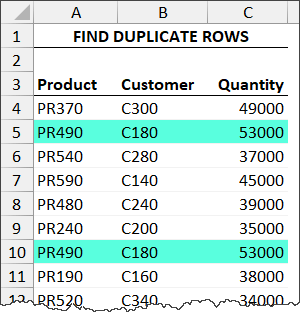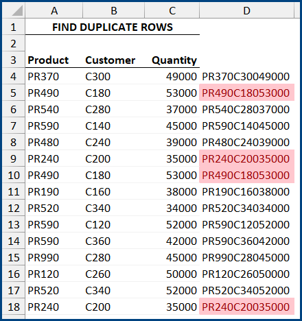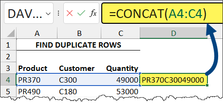 To use a formula to locate duplicate rows of data in a table, combine the previous examples of using a “helper column”, the CONCAT Function, and the COUNTIF Functions.