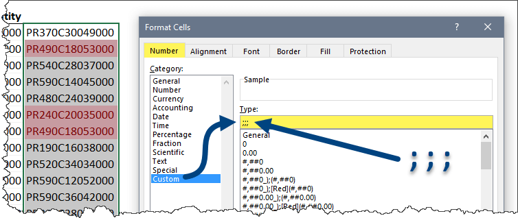 - To keep your sheet tidy, you might want to hide the combined data in the helper column. Click on the column header to select it, press Ctrl + 1 to open the format cells window, and under ‘Custom’, type ;;; (three semicolons). This makes the text in the cells invisible.
