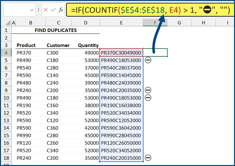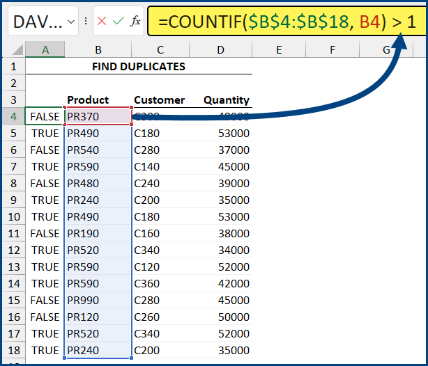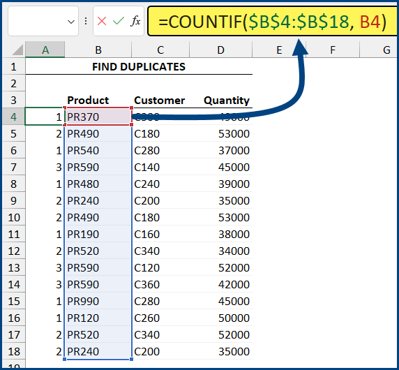 = COUNTIF($B$4:$B$18, B4)Here, $B$4:$B$18 is the range where you’re looking for duplicates, and B4 is the cell you’re checking. Adjust the range according to your data.