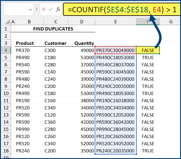 =COUNTIF($B$4:$B$18, B4) > 1This will return “True” for duplicates and “False” for unique entries.