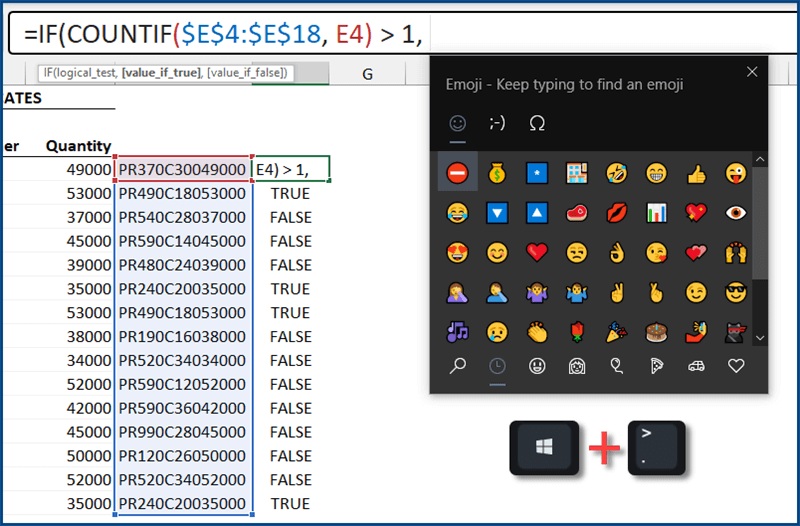 =IF(COUNTIF($E$4:$E$18) > 1,Now, for the [True] argument, we’ll press Win+period (Win+.) to bring up the Windows Emoji Library and select a symbol we wish to reflect a “hit” when we have a duplicate entry.