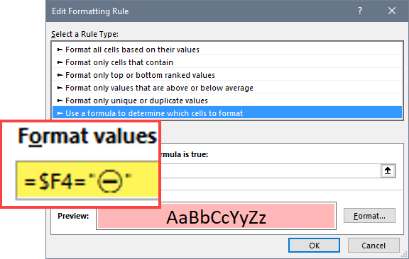 - For the Rule Type, select “Use a formula to determine which cells to format”, and enter the following formula (making sure to lock the column reference but not the row reference):