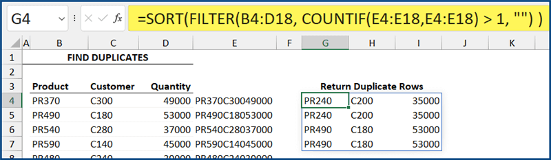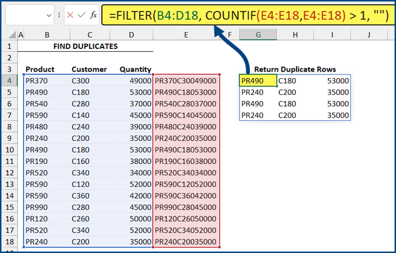 Using the “helper column” of concatenated data, we can use the FILTER Function to reduce the list of source data using the COUNTIF Function as the filter criteria, only keeping entries that occur more than 1 time.