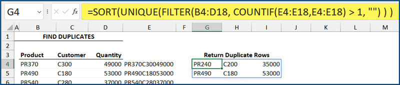 =FILTER(B4:D18, COUNTIF(E4:E18,E4:E18) > 1, "")