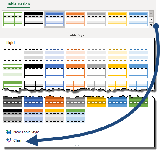 If you want all the features of a Data Table without the decorative styles, click the lowest button to the right of the Table Styles group and choose Clear.