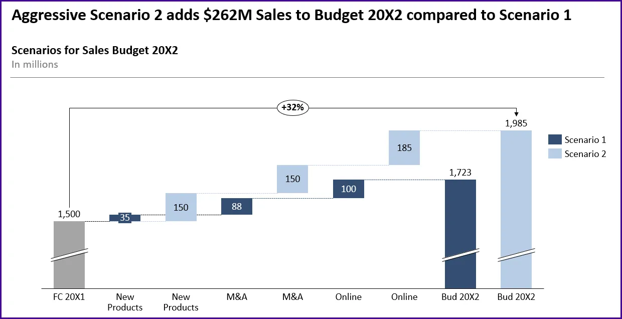Our viewer can easily compare the budget differences between the categories and each scenario’s impact, while a custom heading that clearly describes the chart’s information is a nice touch.