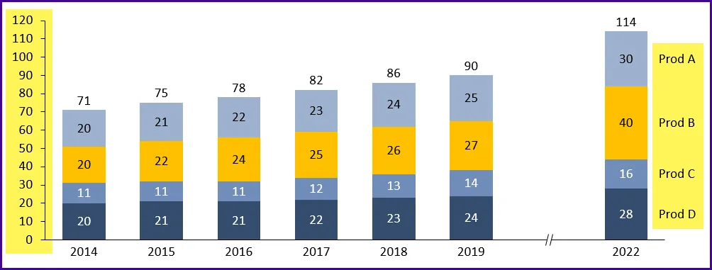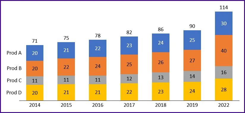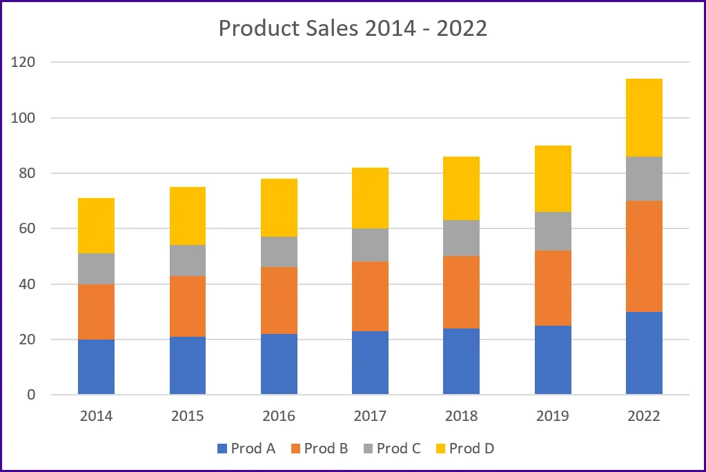 If we want to change the series color that represents “Prod D”, one way is to click the leftmost series for “Prod D”, then hold down Shift and click the rightmost series for “Prod D”.