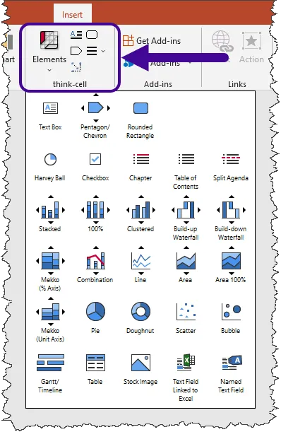 In PowerPoint, we begin with a blank slide and select Insert (tab) -> think-cell (group) -> Elements. We are presented with a myriad of visualizations we can add to our slide.
