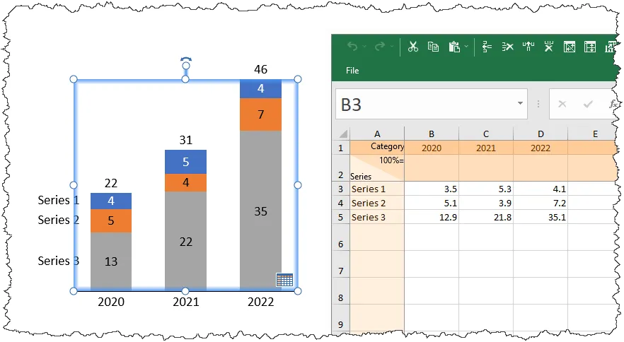 It’s a bit bland to start with but it does have some nice features, like totals above the columns and series labels to the left of the first column.