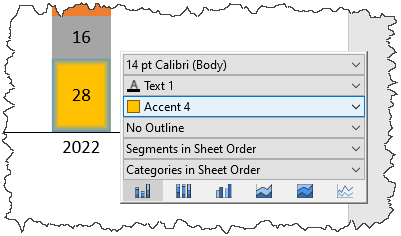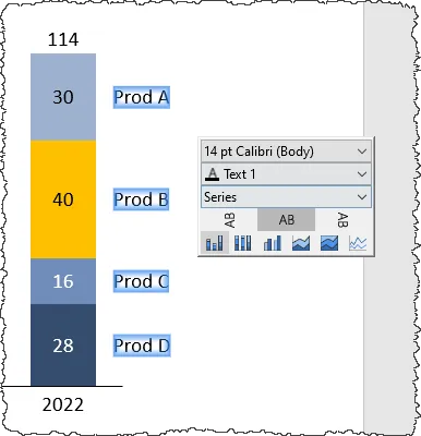 We can’t use the CTRL-A shortcut because the system will target each value in the selected series. We want all series in the year 2022. This will require the Click-Shift-Click approach to selecting chart objects.