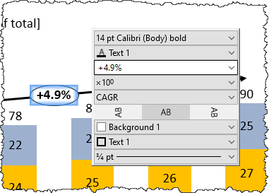 We can customize the CAGR line’s text by selecting the circular text and editing the decimal precision, written text, and a host of other text-based changes.