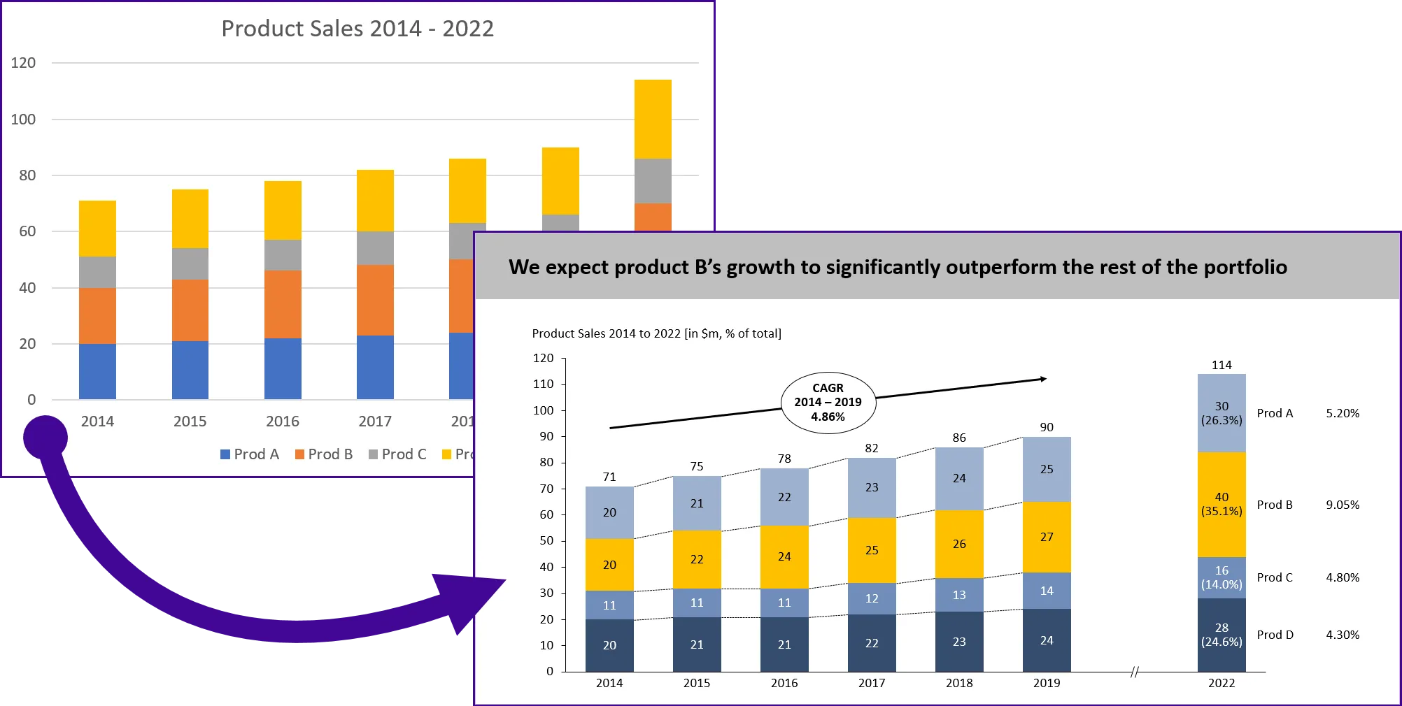 This type of bog-standard chart is easy to create in PowerPoint, but we need something that stands out and draws attention to your effort and hard work.