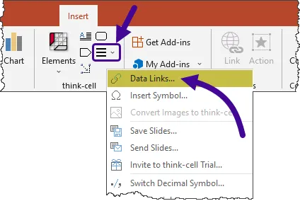 Because we want the chart to update automatically when new data is added to the Excel file, we click the Helpful Tools button in the think-cell feature group and select Data Links.