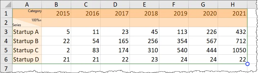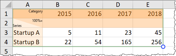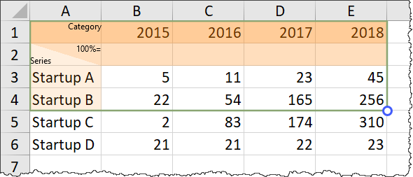 Returning to the Excel file, we see that think-cell has added a bit of formatting to indicate what data is being observed by the think-cell line chart.