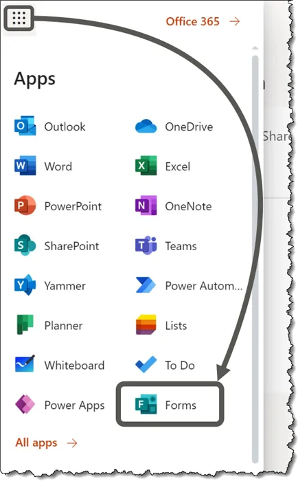 NOTE: If you don’t see the Forms app listed, click All Apps to reveal the complete list of Microsoft apps.